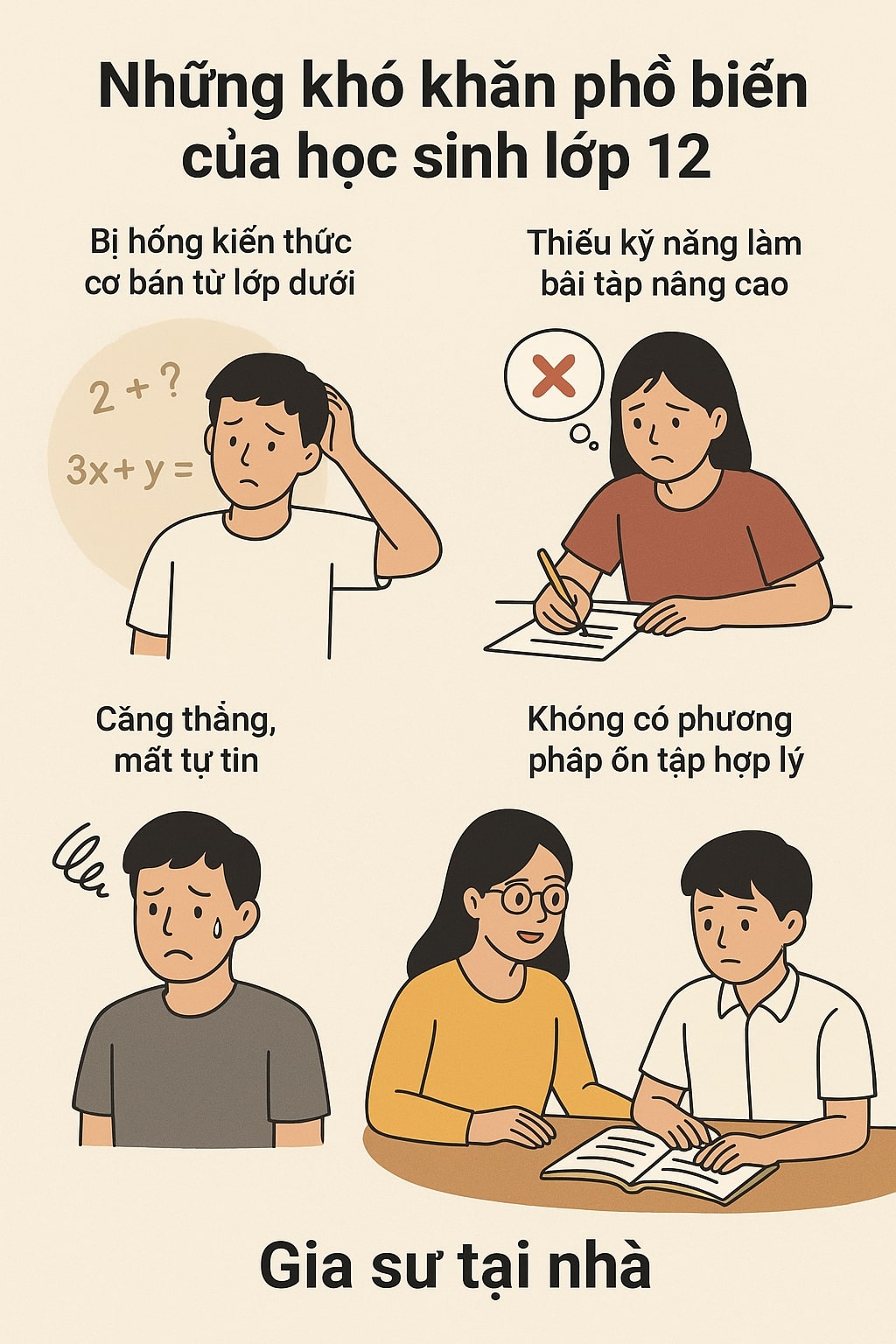 Nhiều học sinh lớp 12, thường gặp phải các vấn đề như: bị hổng kiến thức cơ bản từ lớp dưới, thiếu kỹ năng làm bài tập nâng cao, hay không có phương pháp ôn tập hợp lý. Các em có thể rất chăm chỉ nhưng kết quả học tập lại không cải thiện do không tìm được hướng đi đúng đắn. Một số em khác lại cảm thấy áp lực lớn từ điểm số và kỳ vọng của gia đình, dẫn đến căng thẳng, mất tự tin.